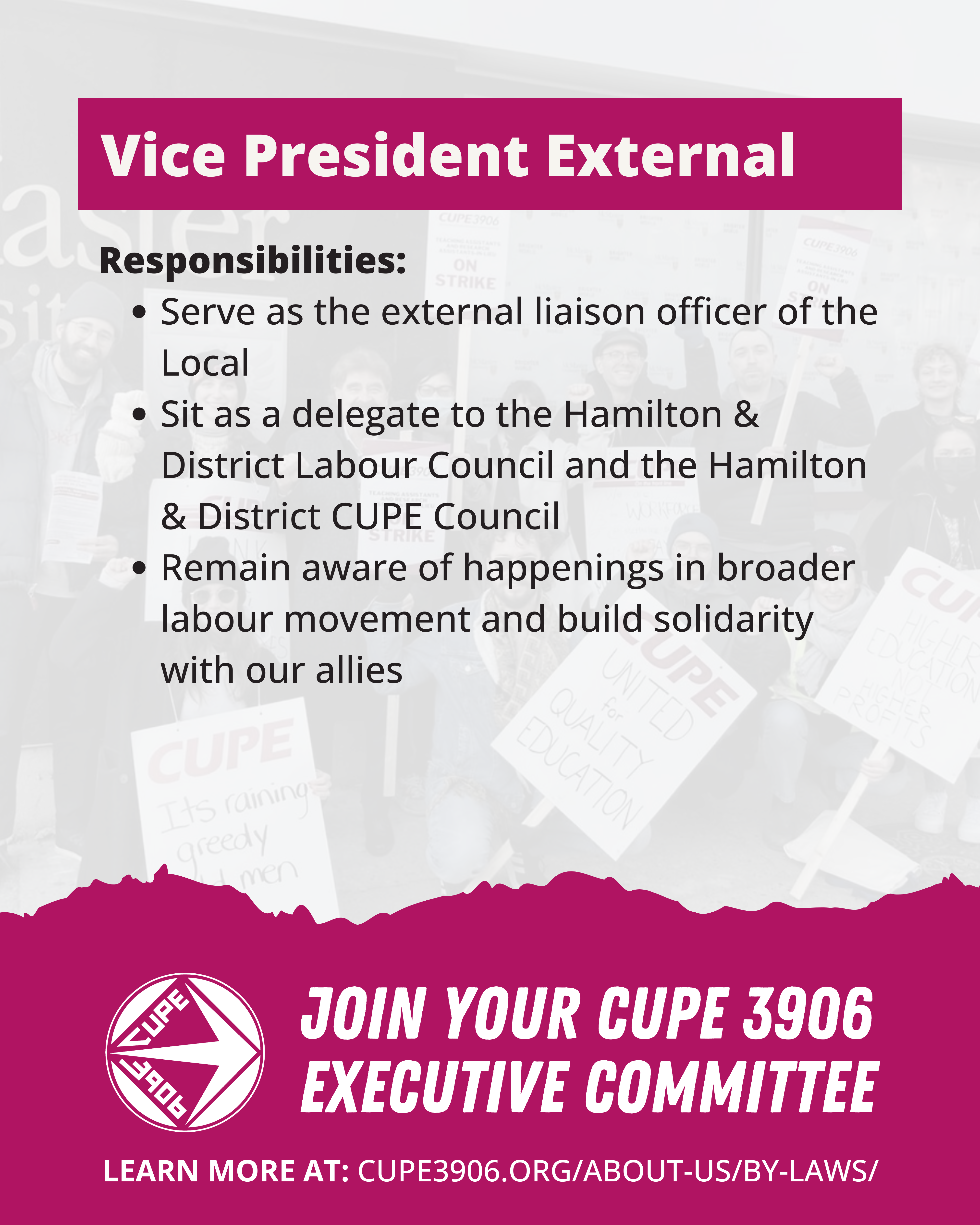 We have a vacancy on our executive committee for the Vice President External position. This position is open to all Local 3906 members and will be elected at our next General Membership Meeting (Tuesday, October 21st, 3 p.m. via zoom). You can find more about the position on the infographic below.