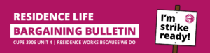 As you may know, a Unit 4 (Residence Life) strike vote was held a couple weeks ago, and members responded 90% in favour of striking if talks break down at the bargaining table. Following this strong mandate delivered by Unit 4 members, we are now forming a Unit 4 Strike Committee to organize and plan for a potential strike.